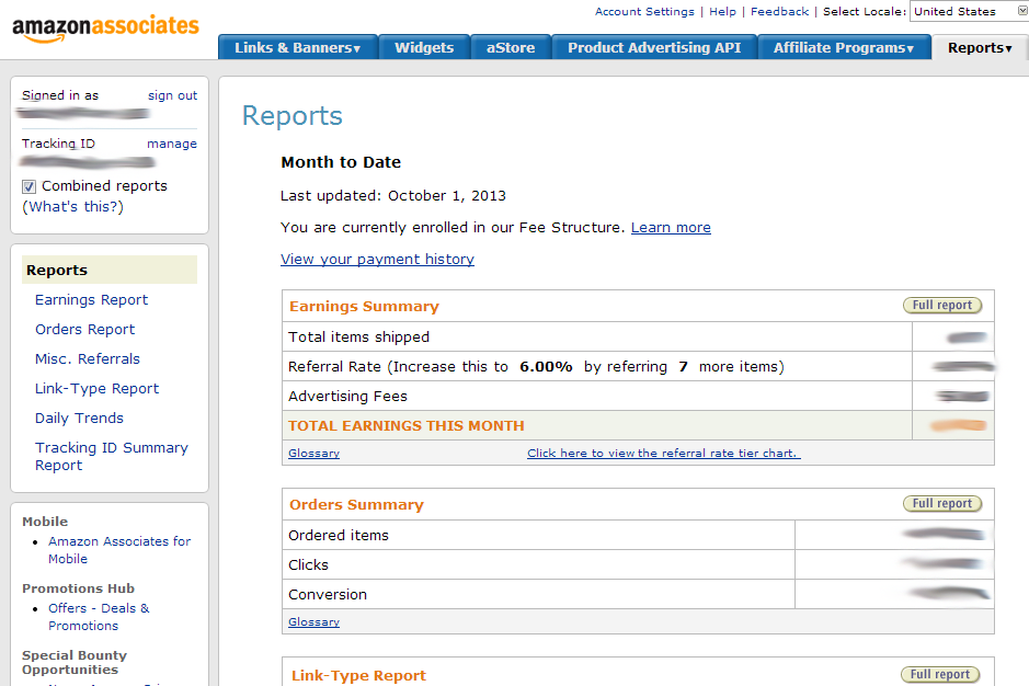 - Reporting: Reports can be created for any custom period of time of any length. Reporting options include earnings reports, orders reports, miscellaneous referrals, link-type reports, daily trends, or tracking ID summary reports, which is helpful if you have more than one tracking ID (e.g., in the case of monetizing more than one site). Stats are available on earnings, order amounts, commission amounts, clicks, and more.