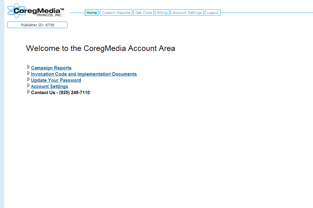 - Control Panel: The CoregMedia admin control panel is very bare bones. Its design is seemingly straight out of 1998, complete with an animated GIF logo, which may raise some eyebrows as to the technical proficiency of the CoregMedia team. Aesthetics aside, the control panel does get the job done for the most part, though there are some omissions. There are pages for custom reports, getting code, billing, and account settings. But there is no form to update account information such as billing address, contact, phone number, etc.; also, there is no help or account support functionality within the control panel.