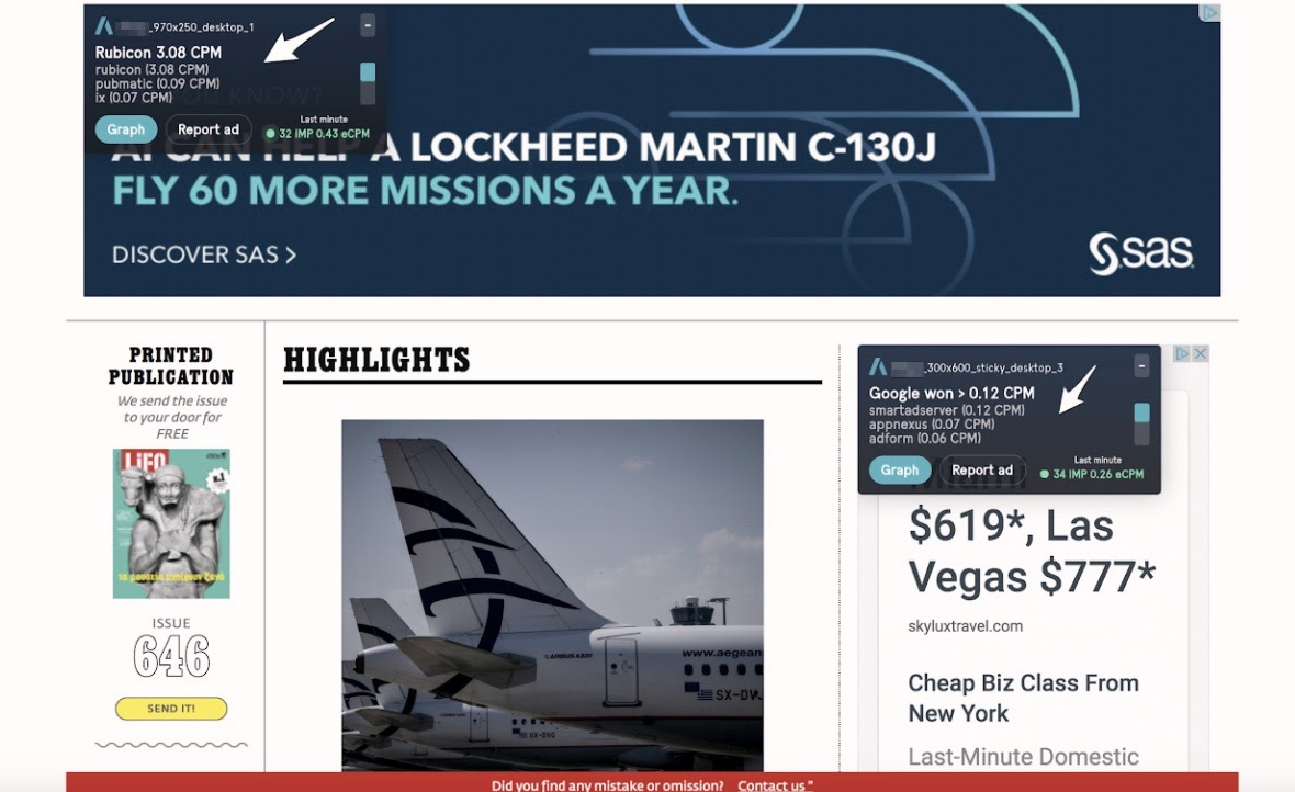 Besides reporting interface, Setupad also offers its clients a plugin that allows them to easily track how banners are performing on their website. It is an overlay on Setupad banners, and it contains header bidding auction information, has a historic statistics tool, and allows to report unwanted ads.